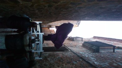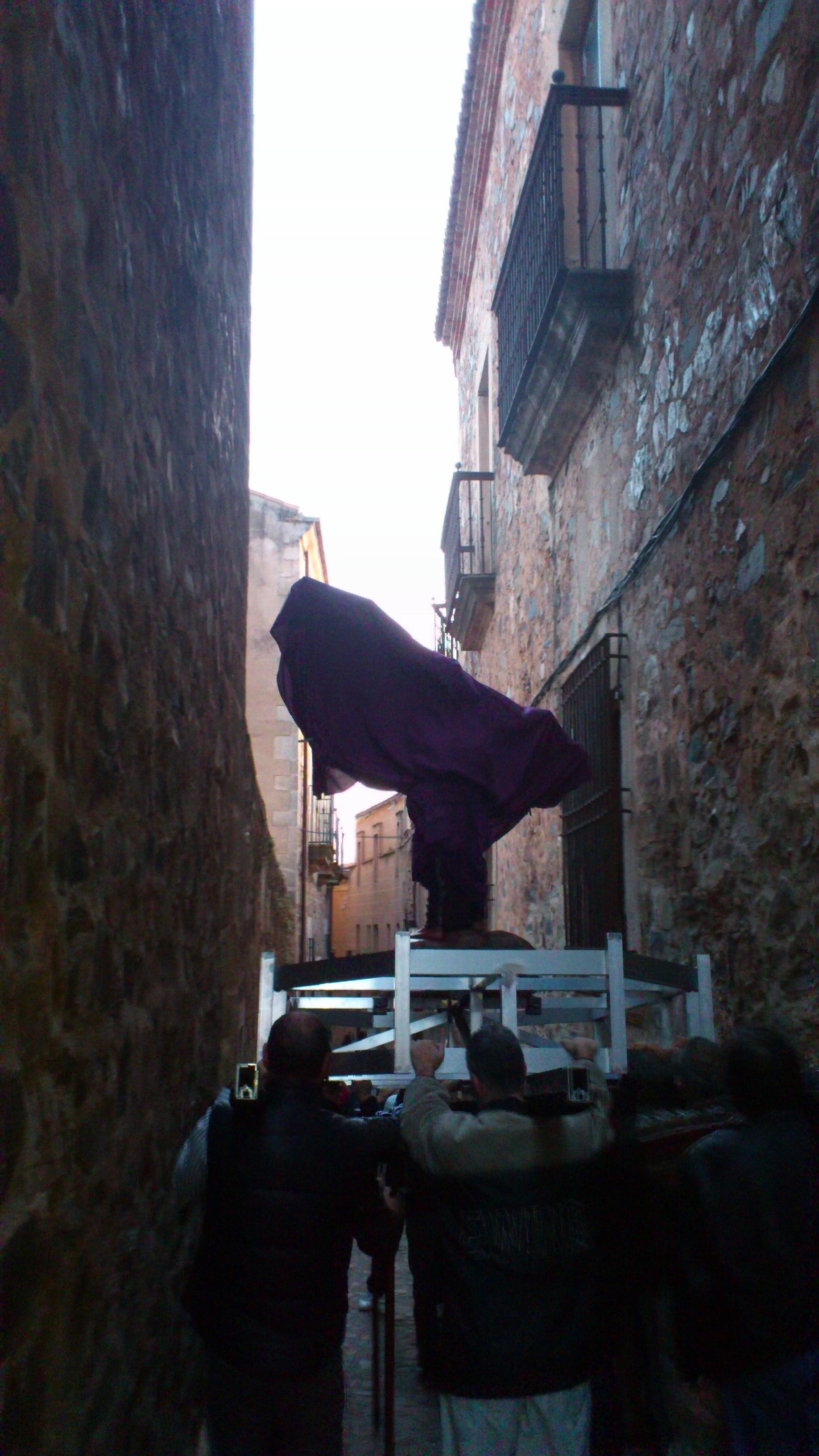Después del traslado se ha realizado una prueba en la embocadura estrecha de la calle Manga (con salida hacia el Palacio de los Golfines de abajo), y hemos podido comprobar que el paso puede transitar sin problemas por ese tramo si la hermandad lo considera necesario. También hemos confirmado la opción de poder procesionar por la calle Arco de Santa Ana, con salida hacia la calle Orellana y cruce de Condes con Olmos. Las dimensiones y los varales plegables de las andas han facilitado todas estas maniobras.