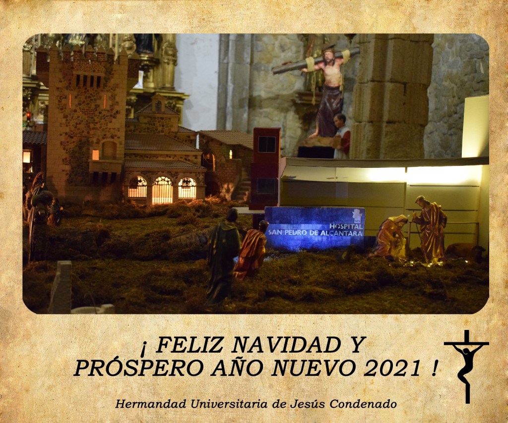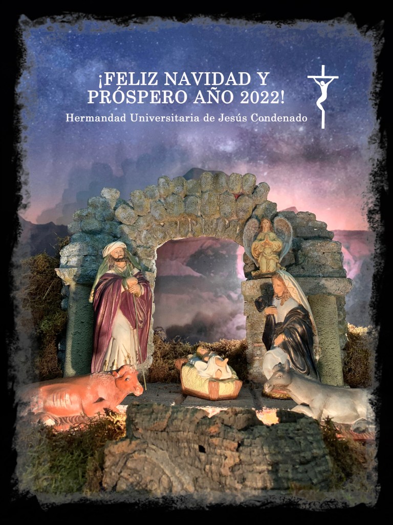 La Hermandad Universitaria de Jesús Condenado quiere desearos a todos una Feliz Navidad y un próspero año nuevo 2022. Como viene siendo habitual, la felicitación representa el Belén Solidario de la Hermandad situado en la Ermita de la Paz, visitable durante todas las navidades, y cuyos donativos irán destinados íntegramente a la misión “Casa Santa J.Bakhita” en Kenia.